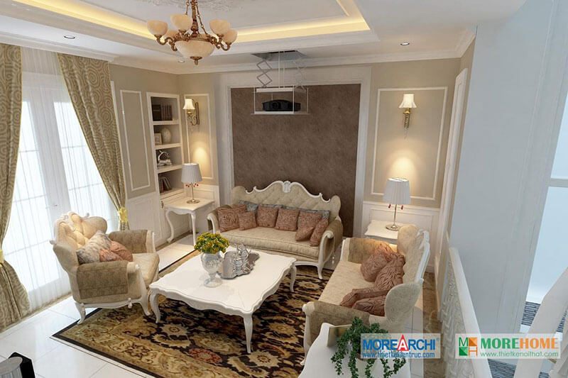 Thiết kế phòng khách sang trọng với nội thất sofa bọc nỉ tân cổ điển với đường cong nhẹ nhàng ở thân ghế tạo điểm nhấn ấn tượng